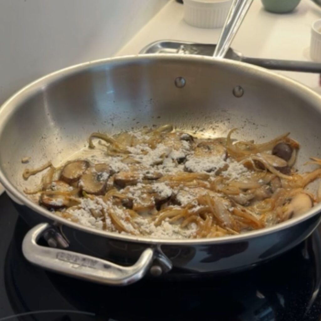 Cook the aromatics: In the same skillet, melt the butter. Add the onions and cook for about 3 minutes until softened. Add mushrooms and cook for a few more minutes, stirring occasionally. Stir in garlic and cook for 30 seconds.